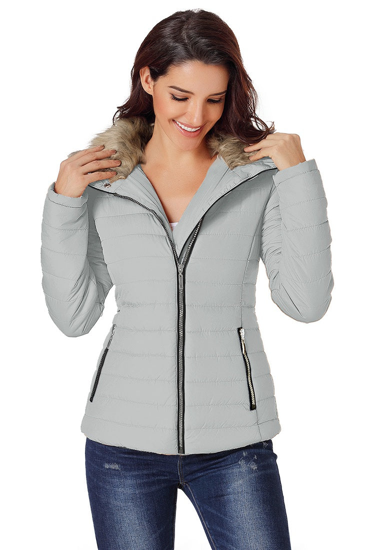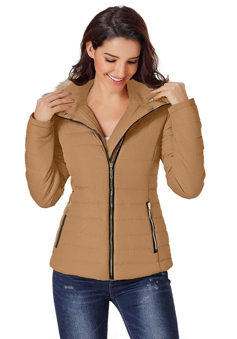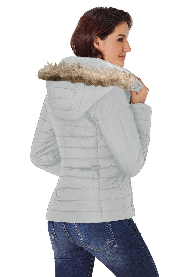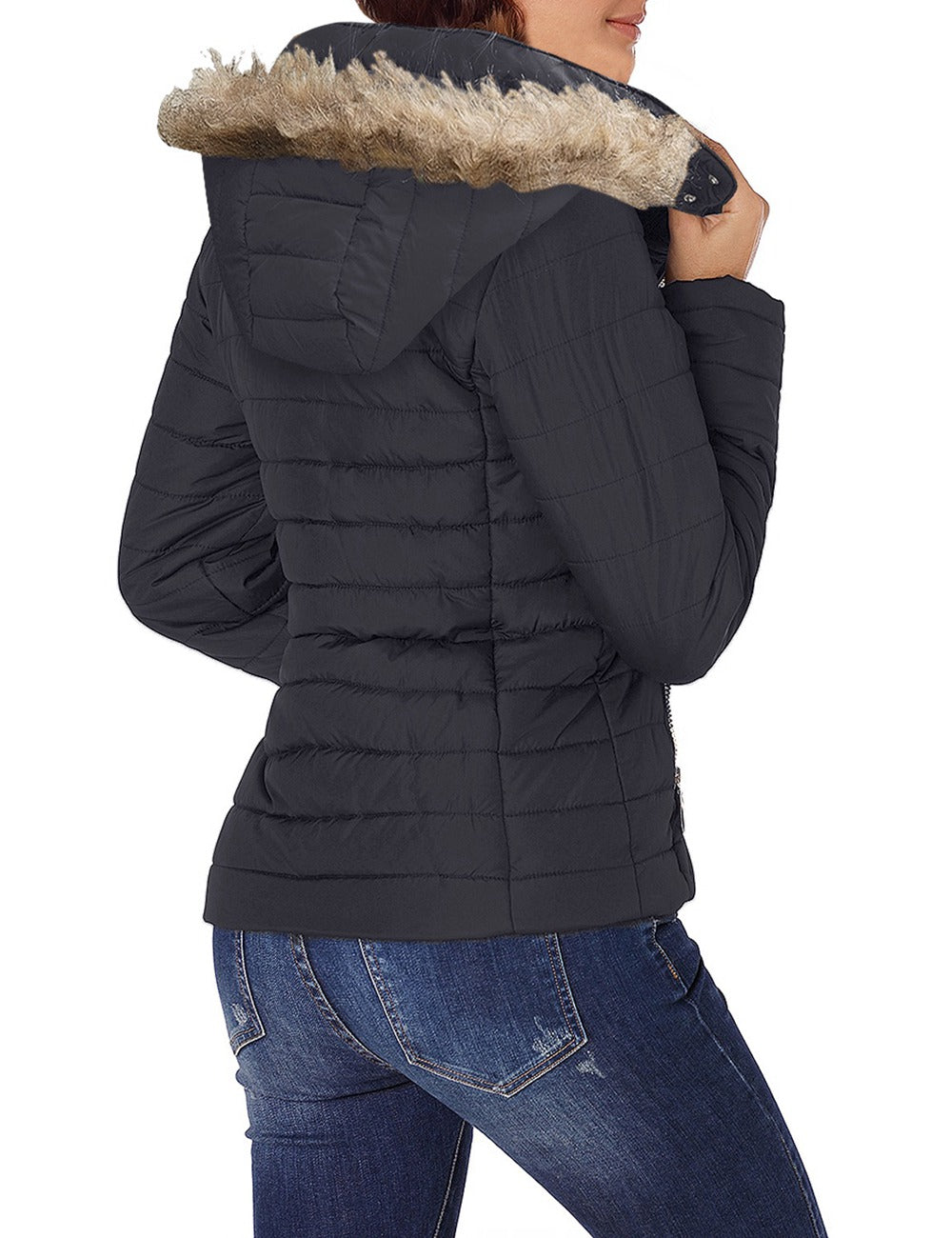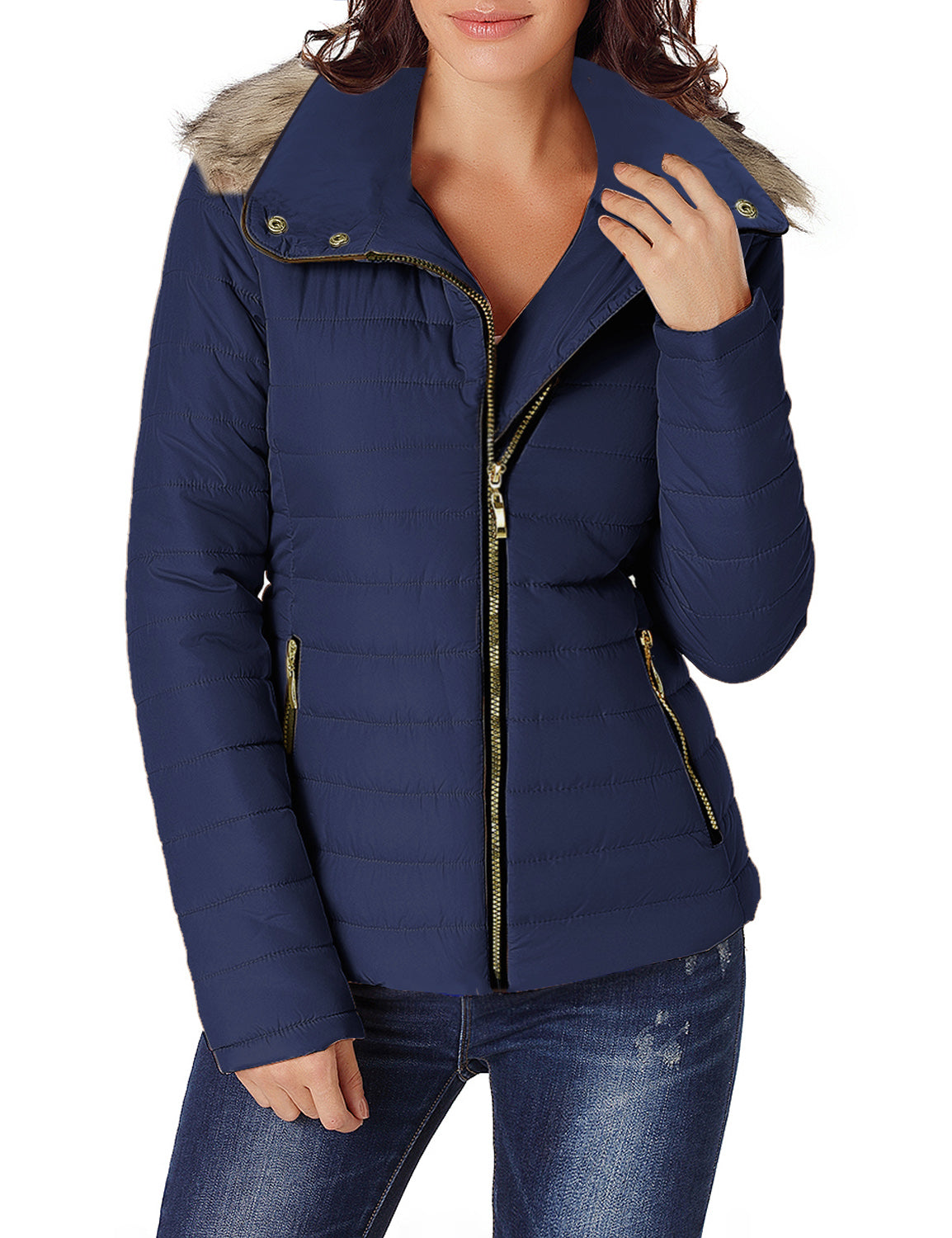 Vetinee Women Casual Faux Fur Lapel Zip Pockets Quilted Parka Jacket Puffer Coat