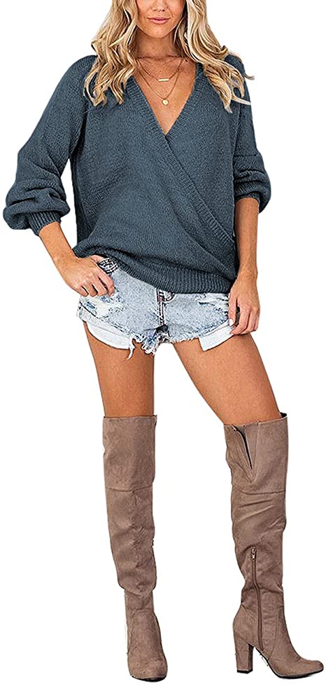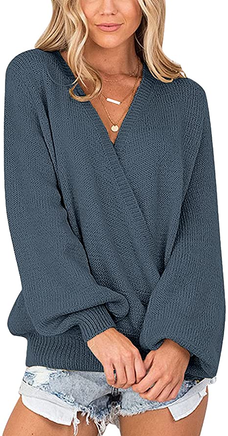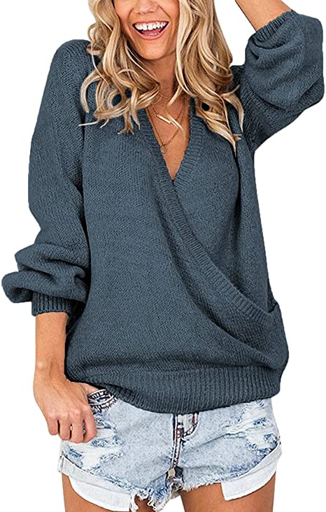 Vetinee Women's Deep V Neck Wrap Front Knit Long Sleeve Sweater Pullover Tops